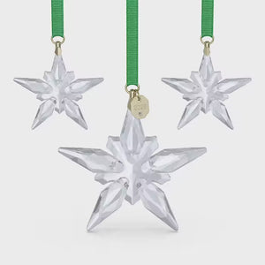 This magical holiday set continues the iconic tradition of Swarovski's Annual Edition Ornaments. The set features three clear stars, crafted with a total of 570 facets, that are inspired by the serenity of the night sky. Each star is suspended from a green grosgrain ribbon with champagne gold-tone plated accents, while the large star also includes a 2025 engraving on the tag. Designed especially for the festive season, this commemorative set would make a truly elegant gift or take pride of place in your own festive décor. Decoration object. Not a toy. Not suitable for children under 15.