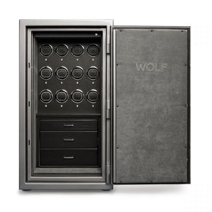 The ultimate in security for your watches, jewelry & valuables. Forged in American steel, UL tested and certified for burglary & fire, the Atlas is an impenetrable fortress. Painted steel polished to a mirror finish, drawers lined with LusterLoc™ treated fabrics that stop tarnishing for 35 years. Watch winders are controlled by WOLF’s Bluetooth connected App. Control one or all winders at the same time.