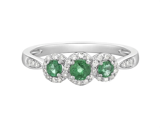 14K White Gold 3.50mm and 2.80mm Round Cut Emerald and 0.18cttw Diamond Halo Ring - Size 7