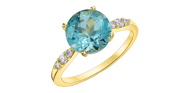 • 10K Yellow Gold 9mm Cushion Cut Sky Blue Topaz and 0.12cttw Diamond Ring