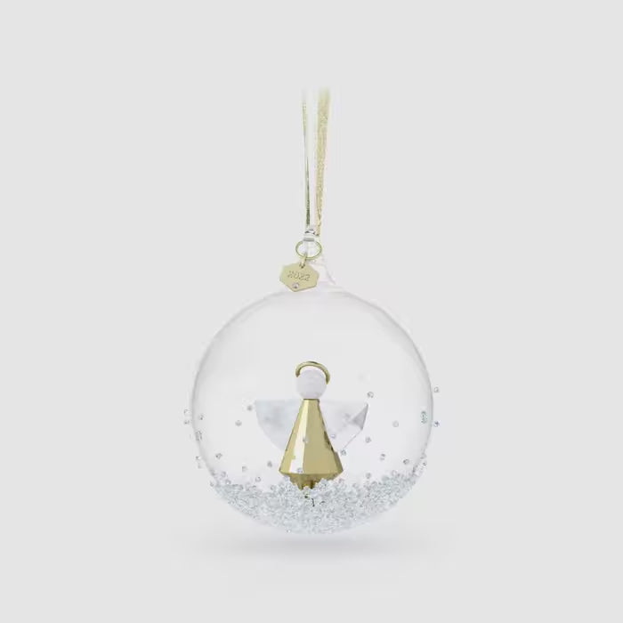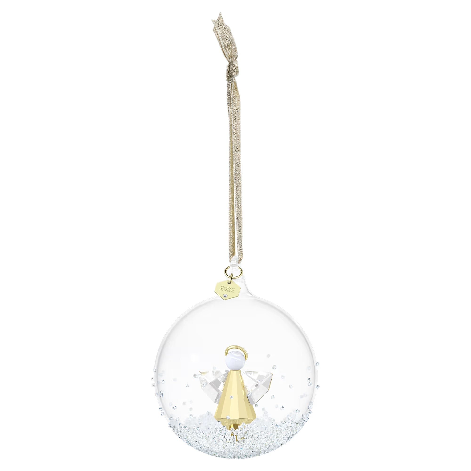 Brimming with festive elegance, the Swarovski Annual Edition Ball Ornament for 2022 is a timeless gift to share with loved ones. The design features a hand-blown glass ball with an angel, shining with 41 facets and luxury champagne gold-tone metal, nestled within. Suspended from a golden lamé ribbon and topped with an elegantly engraved, crystal-studded tag reading '2022', the ball is decked in approximately 2,000 crystals, each coated with our Moonlight effect. Hand-placed on the outside of the ball, they create an individual snow-like shimmer that's unique to every piece. Only available this year, this festive decoration is an ideal design to commemorate an anniversary, wedding or birthday. Decoration object. Not a toy. Not suitable for children under 15.