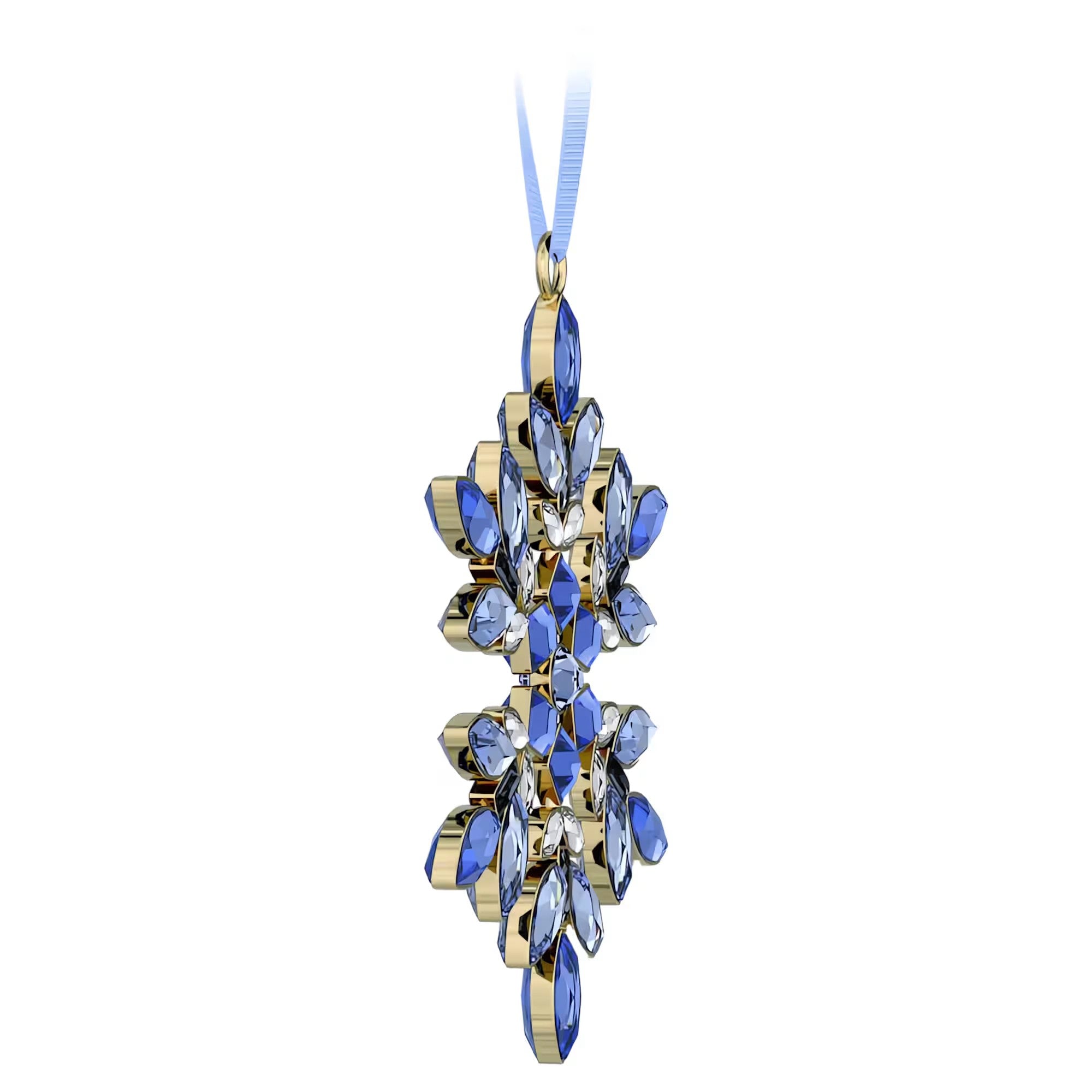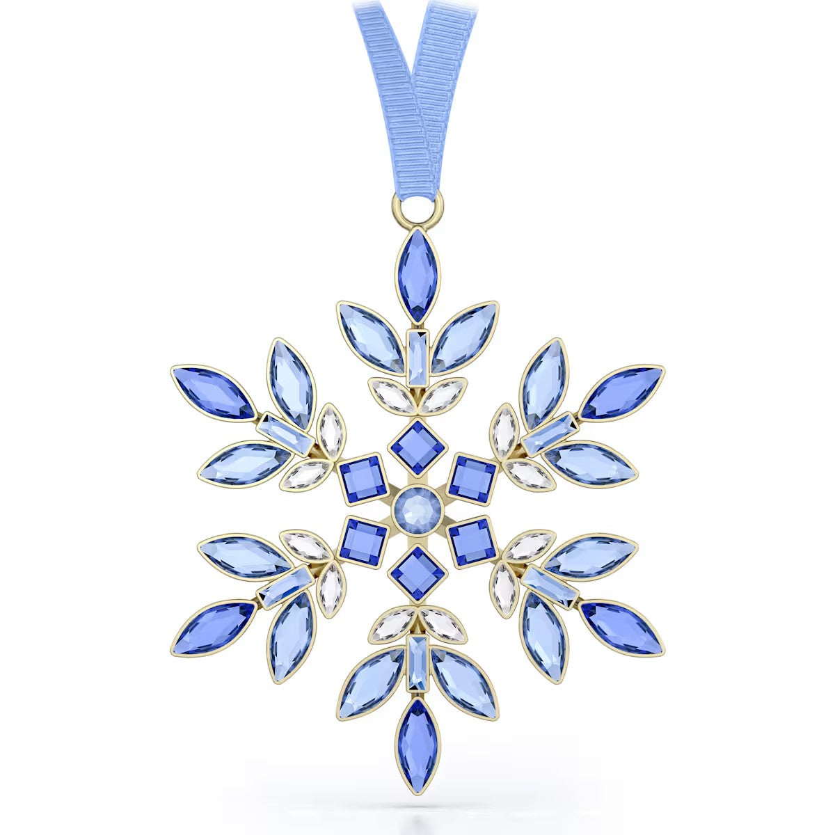 Inspired by the vibrant Gema family, this collection of radiant snowflake ornaments is presented in Swarovski brand colors with a nod to the holiday season. This blue piece is formed from 86 individual crystals in a variety of cuts and shades, applied on both sides using jewelry stone setting techniques. The design is suspended from a blue grosgrain ribbon and is completed with a glossy gold-tone finish. Collect all four of the Gema snowflake ornaments to create a joyful multicolored display in your home. Decoration object. Not a toy. Not suitable for children under 15.