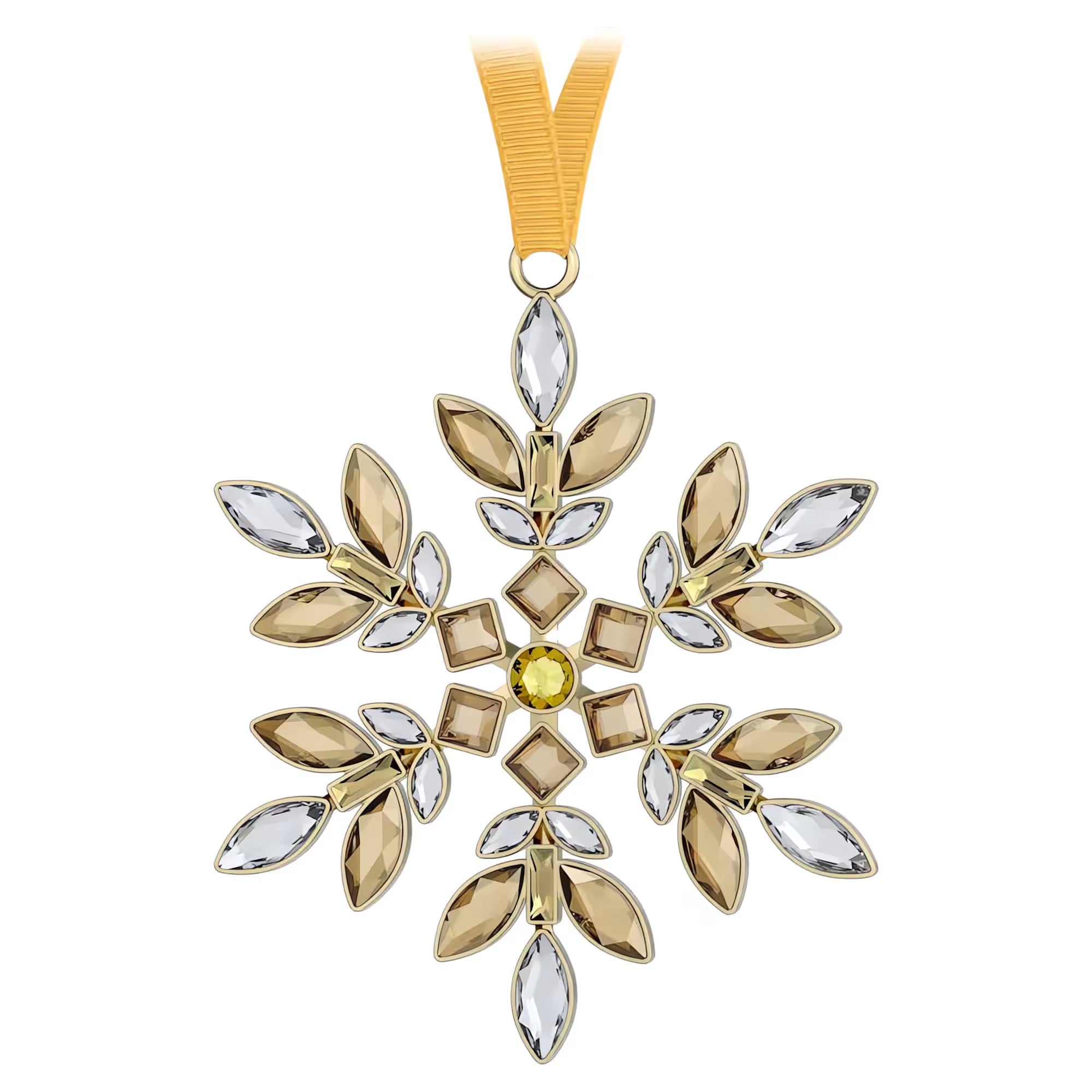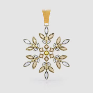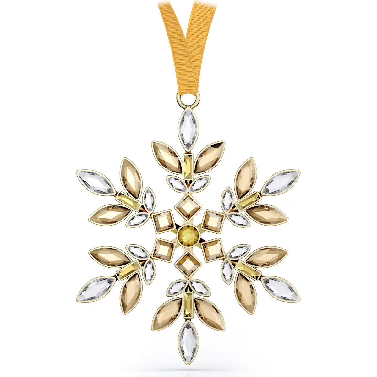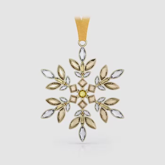 Inspired by the vibrant Gema family, this collection of radiant snowflake ornaments is presented in Swarovski brand colours with a nod to the holiday season. This yellow piece is formed from 86 individual crystals in a variety of cuts and shades, applied on both sides using jewellery stone setting techniques. The design is suspended from a yellow grosgrain ribbon and is completed with a glossy gold-tone finish. Collect all four of the Gema snowflake ornaments to create a joyful multicoloured display in your home. Decoration object. Not a toy. Not suitable for children under 15.
