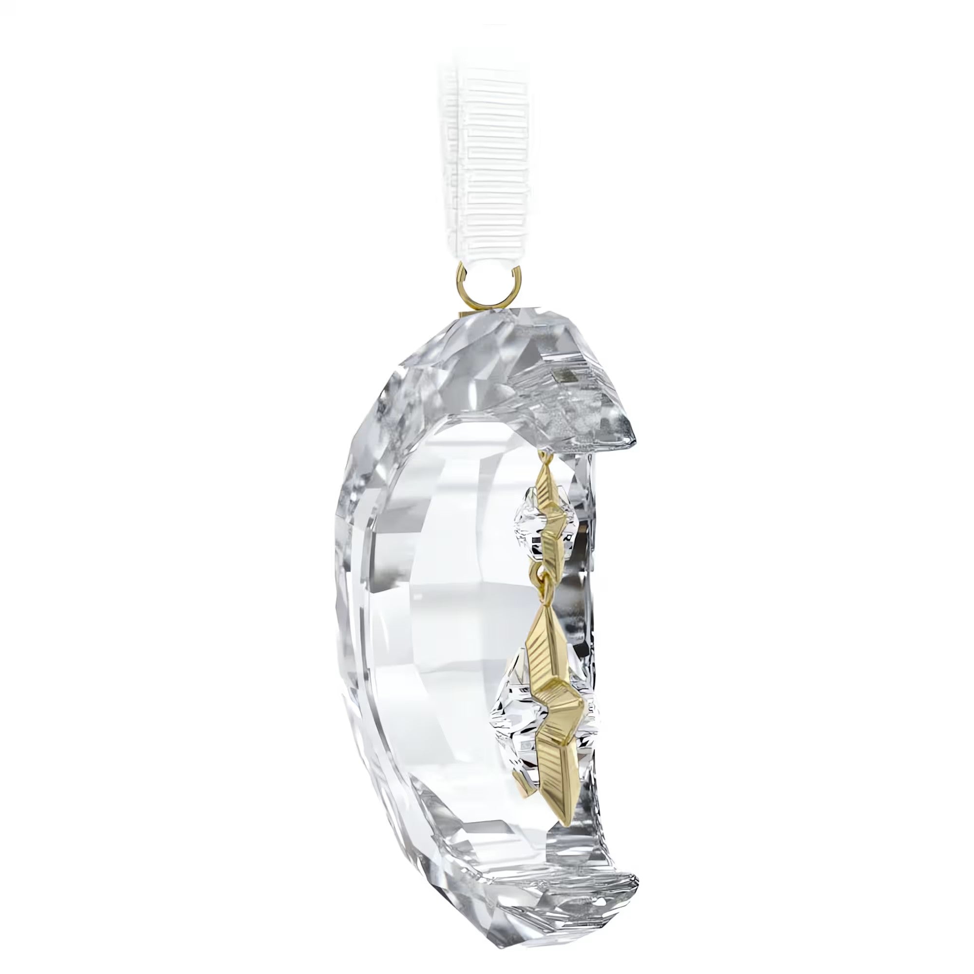 Taking inspiration from a starry night sky, this majestic ornament will bring a celestial touch to any holiday décor. With 200 radiant facets, the shimmering design features a crescent moon with two suspended stars encased in a champagne gold-tone setting. The entire ensemble hangs from a luxurious white grosgrain ribbon. Hang in your home and make a wish for the year ahead. Decoration object. Not a toy. Not suitable for children under 15.