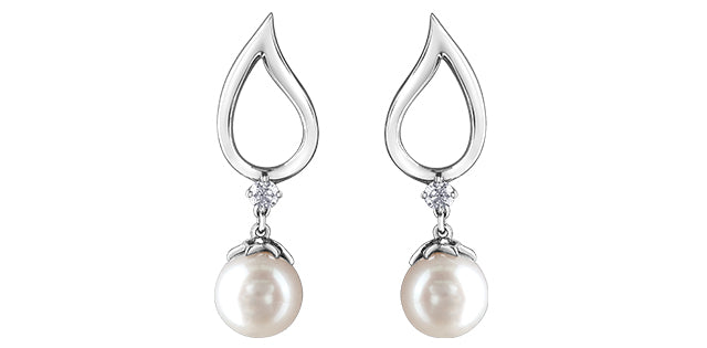 10K White Gold 6.5mm Cultured Pearl and 0.08cttw Canadian Diamond Dangle Earrings