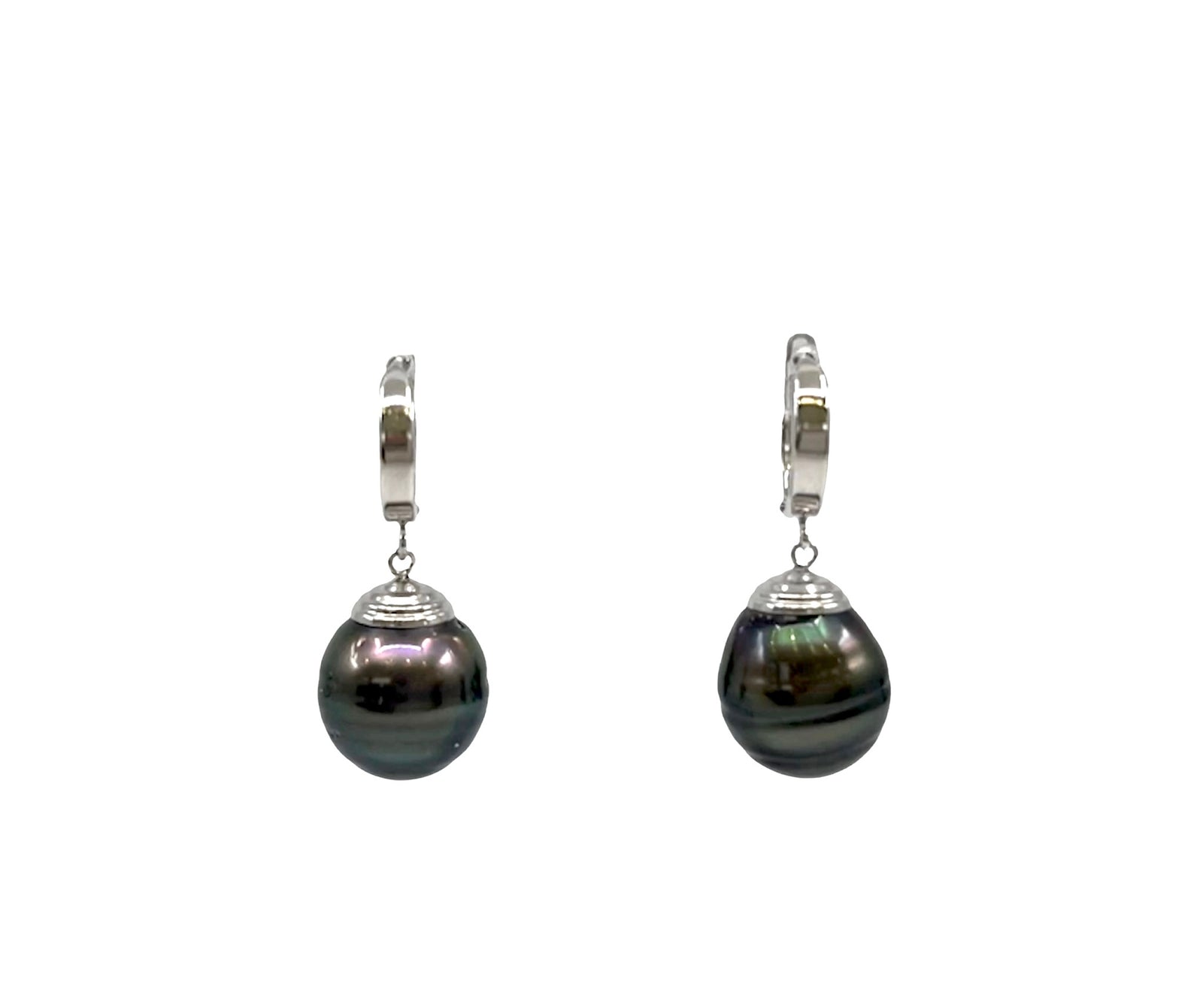 14K White Gold Tahitian Pearl Dangle Earrings with Hoop Closure