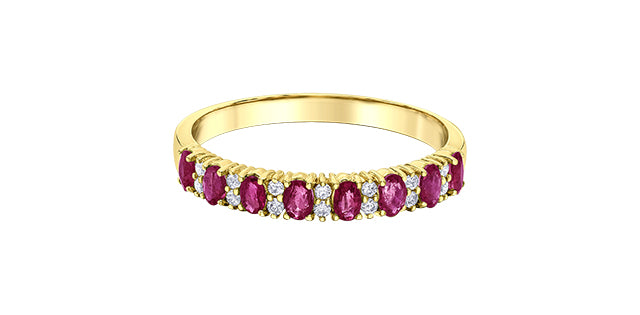 Elevate your style with this exquisite 10K Yellow Gold Ring. Adorned with stunning 3x2 mm rubies and 0.084 cttw of diamonds, this beautifully crafted band adds a touch of elegance to any outfit.