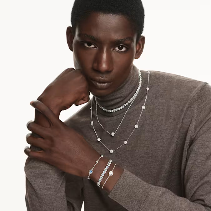 This innovative bracelet can be worn in two unique ways. The rhodium plated chain features a sliding mechanism for an easily adjustable fit and is adorned with metallic balls and a glittering double-sided motif. Simply reverse the bracelet to showcase a different display of round-cut crystals. Mix and match with other Una Angelic pieces for a look of ultimate radiance.