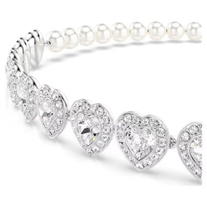 This radiant choker was made for an intense expression of love. The rhodium plated design is partly decorated with luxurious Swarovski Crystal Pearls, while at the front, there is a row of heart-shaped crystals, each surrounded by a glittering halo of clear pavé. A sliding closure at the back means you can adjust the jewelry to your perfect fit. Pair this bold necklace with other matching jewelry to create your own romantic combinations.