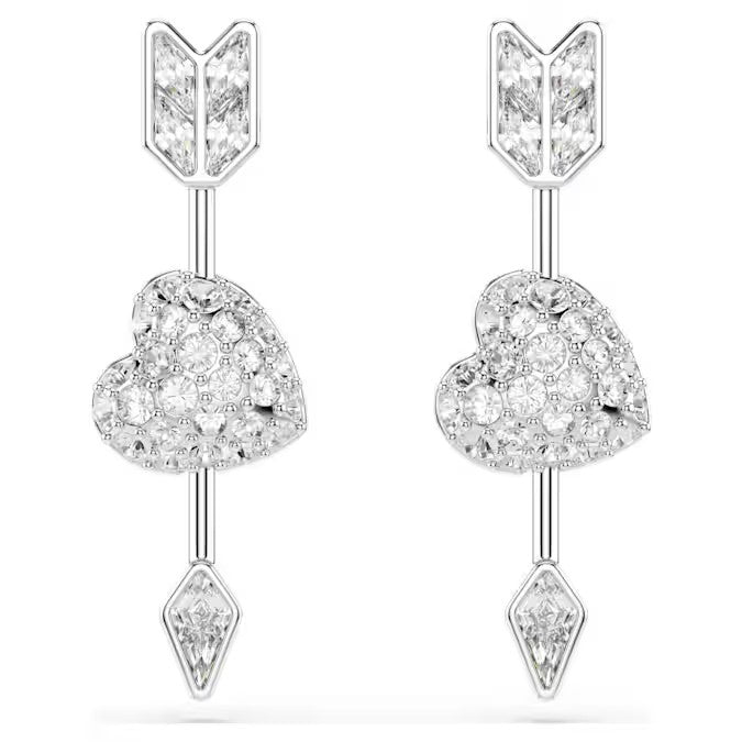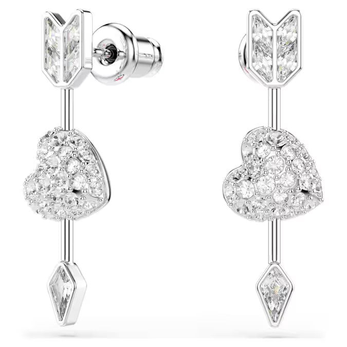 Cupid strikes twice in these expressive Idyllia earrings. Each rhodium plated piece features a love heart pierced by an arrow, with glittering clear crystals on one side, and a vivid pink colour on the other side. Reverse them as often as you like for versatile styling options.