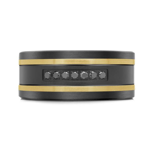 • 14K Yellow Gold, Titanium, Carbon-Fiber and 0.11cttw Black Diamond Mens Band