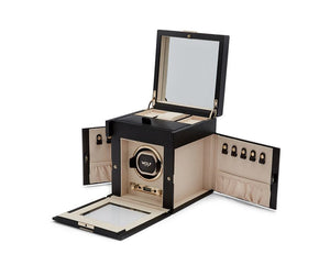 - Almacenamiento: 1 módulo de cuerda, 1 pieza de almacenamiento para relojes, el compartimento superior para joyas cuenta con 10 rollos de anillos y un compartimento cubierto dividido. Las puertas laterales tienen capacidad para 5 collares cada una.