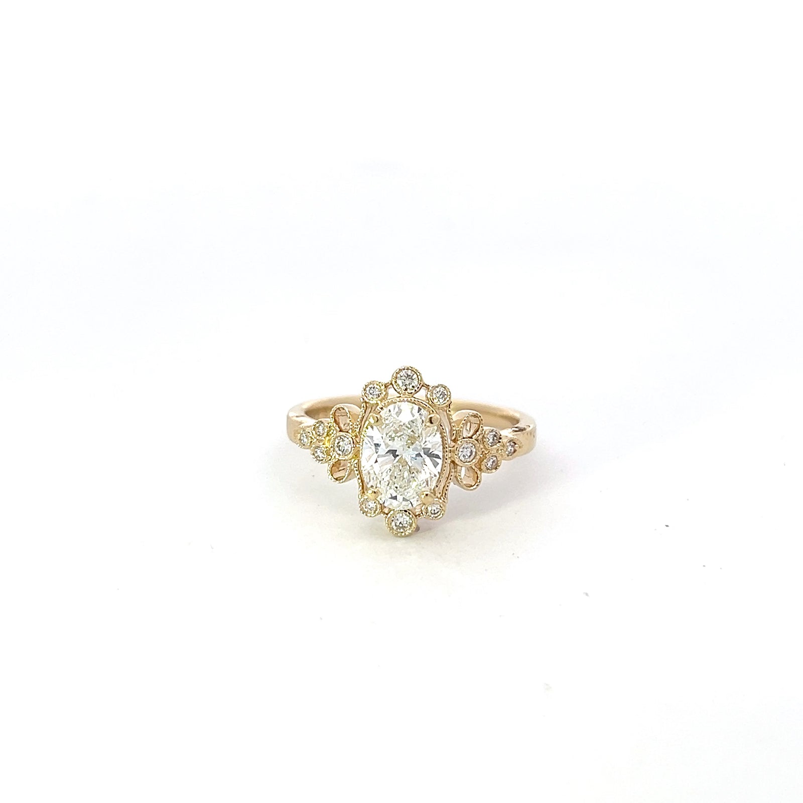 Anillo de compromiso de diamantes de talla ovalada cultivados en laboratorio de 1,55 quilates de oro amarillo de 14 quilates con halo oculto
