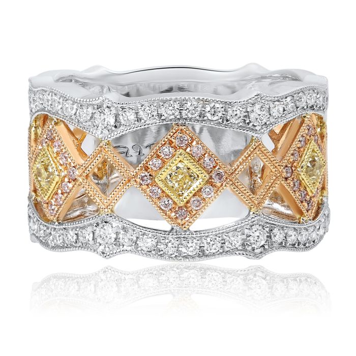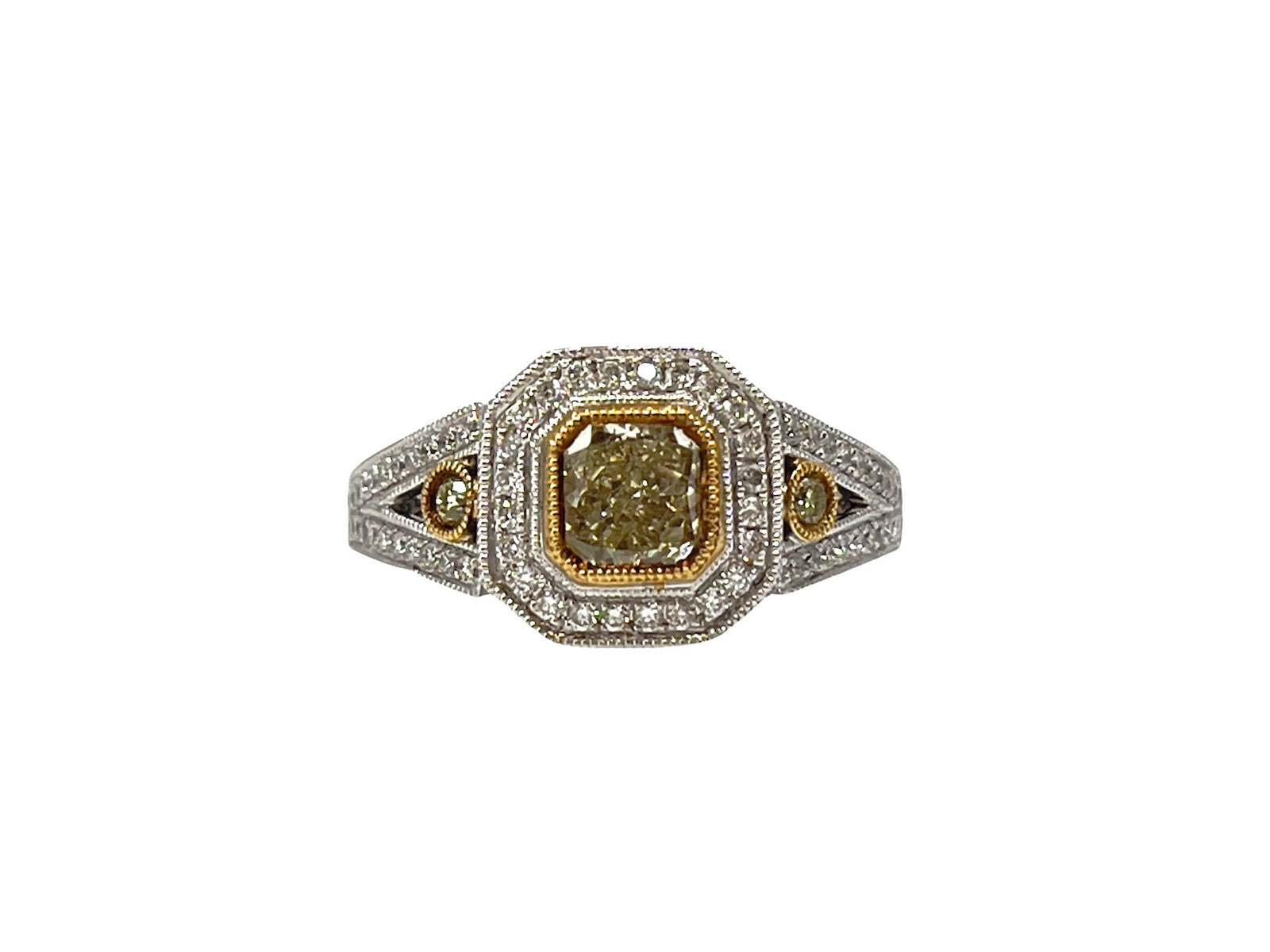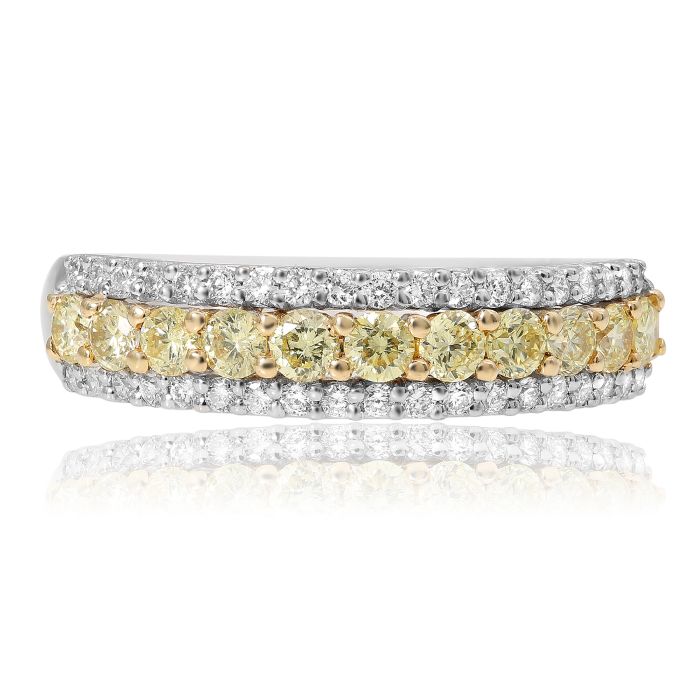 Anillo de compromiso de talla radiante con diamantes amarillos elegantes de 1,10 quilates en oro blanco y amarillo de 18 quilates