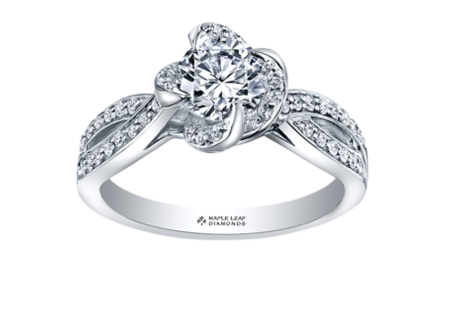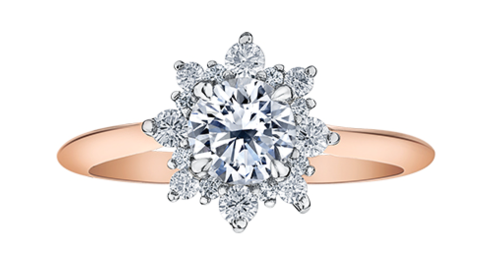 Anillo de compromiso de diamantes canadienses de talla brillante redonda de 1,14 quilates en oro blanco y rosa de 18 quilates