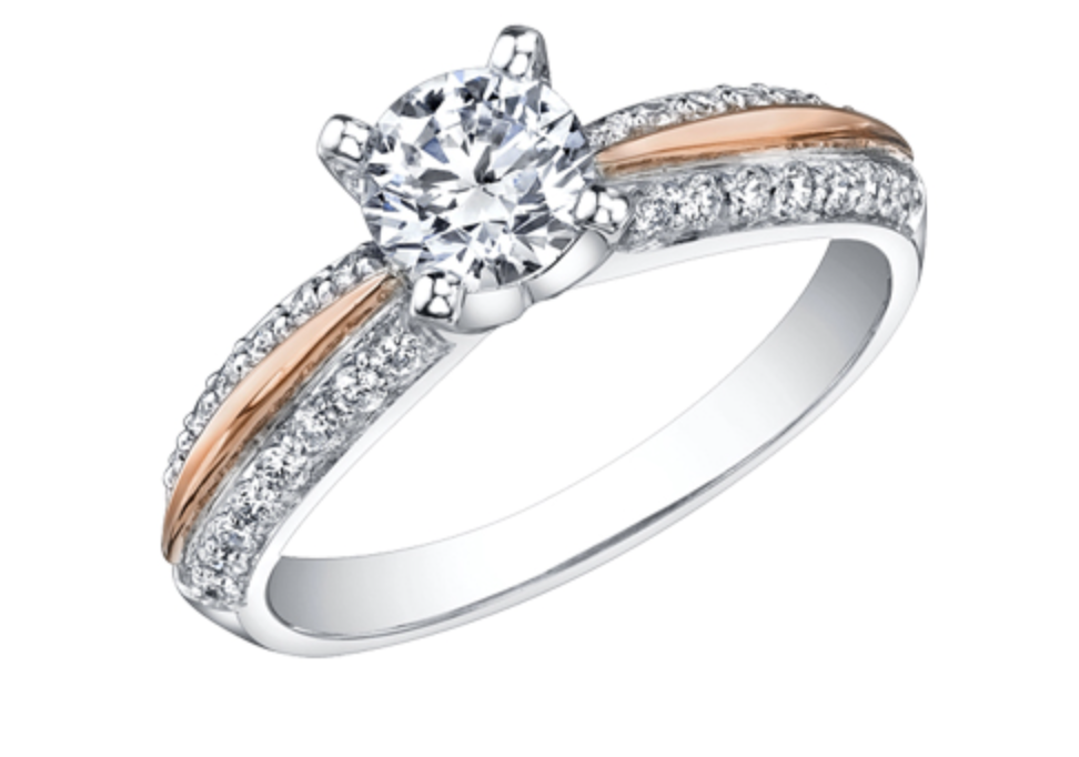Anillo de compromiso de diamantes canadienses de talla brillante redonda de 0,64 quilates en oro blanco y rosa de 18 quilates