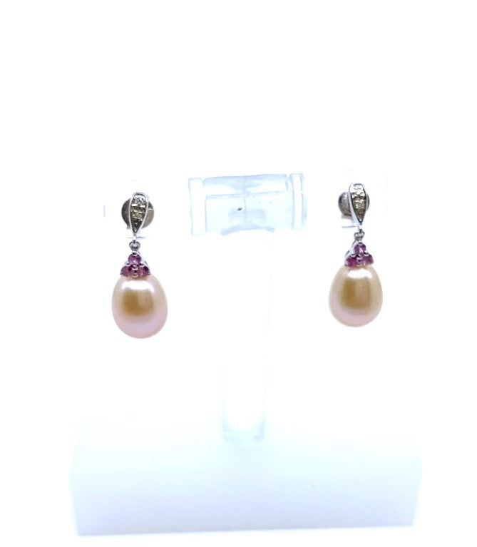Pendientes de perlas de agua dulce, zafiro rosa y diamantes