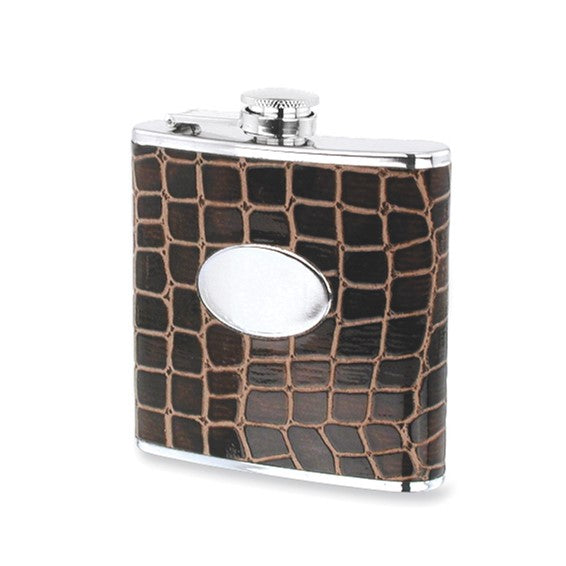 Petaca de acero inoxidable de 6 onzas con embudo y área de grabado ovalada de piel sintética de cocodrilo marrón Rebel Steel - 11,5 cm x 2,5 cmVendidoVendido