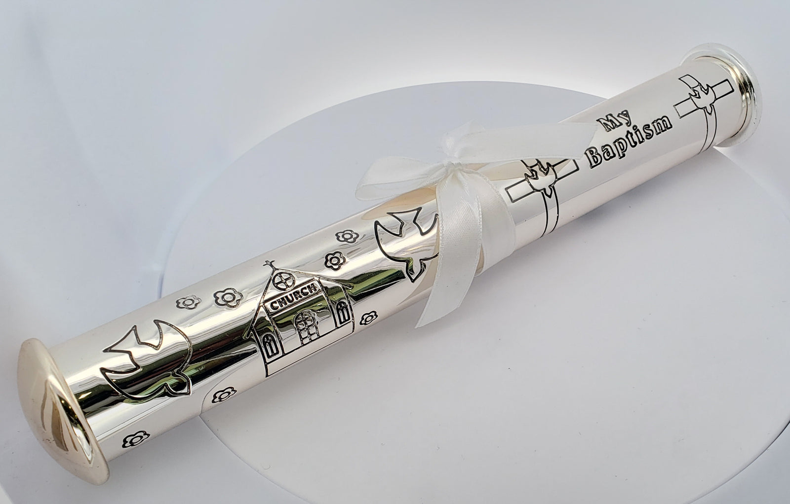 Tubo para Certificado de Bautismo bañado en plata