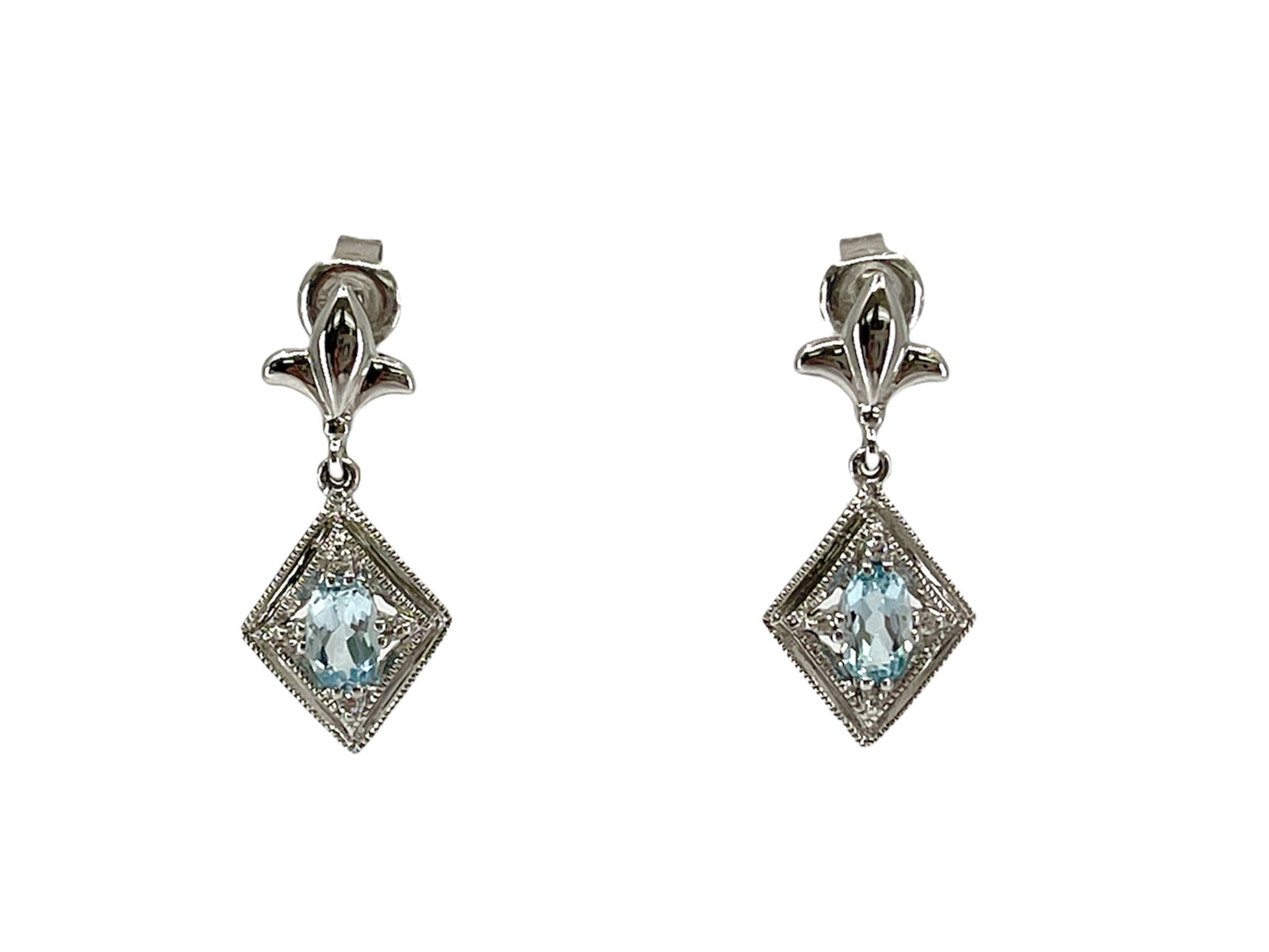 Pendientes colgantes / colgantes de oro blanco de 10 quilates con aguamarinas de 0,64 quilates y diamantes de 0,012 quilates