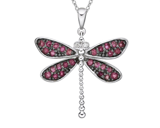 Colgante de libélula de oro blanco de 10 quilates, rubí de talla redonda de 1,30 a 1,60 mm y diamante de 0,01 quilates, 18 pulgadas