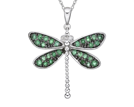 Colgante de libélula de oro blanco de 10 quilates, esmeralda de talla redonda de 1,30 a 1,60 mm y diamante de 0,01 quilates, 18 pulgadas