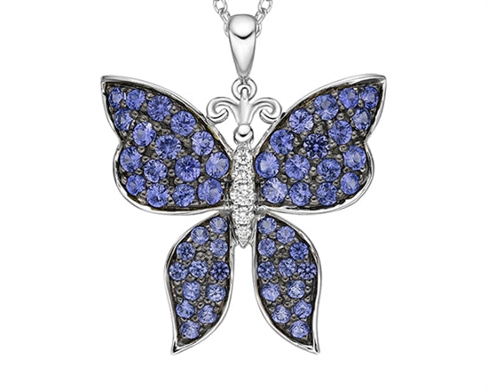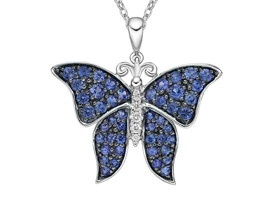 Colgante de mariposa de diamantes de 0,037 quilates y zafiro azul de talla redonda de 1,25 a 2,10 mm en oro blanco de 10 quilates - 18 pulgadas