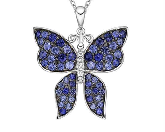 Oro blanco de 10 quilates, mezcla de zafiro azul de talla redonda de 1,25 a 2,10 mm y colgante de mariposa de diamantes de 0,037 quilates, 18 pulgadas