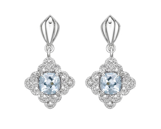 Pendientes colgantes de oro blanco de 10 quilates con aguamarina de talla cojín de 4,0 mm y diamantes de 0,03 quilates