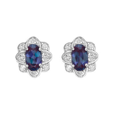 Aretes de oro amarillo de 10 quilates de 5x3 mm con alejandrita creada de talla ovalada y diamantes de 0,08 quilates con respaldo de mariposa