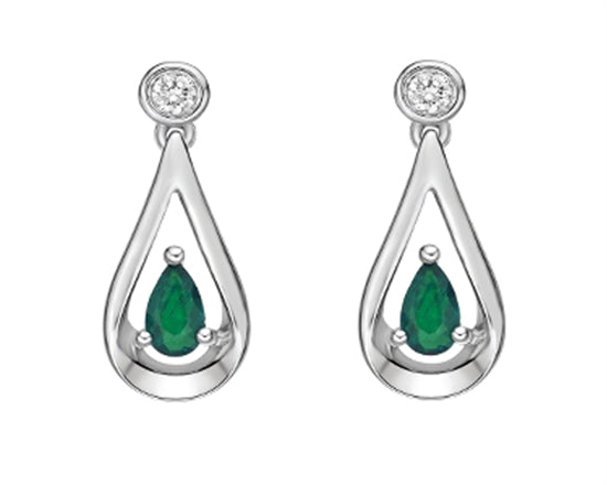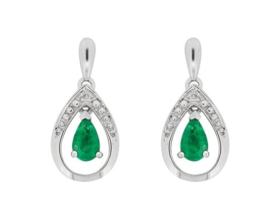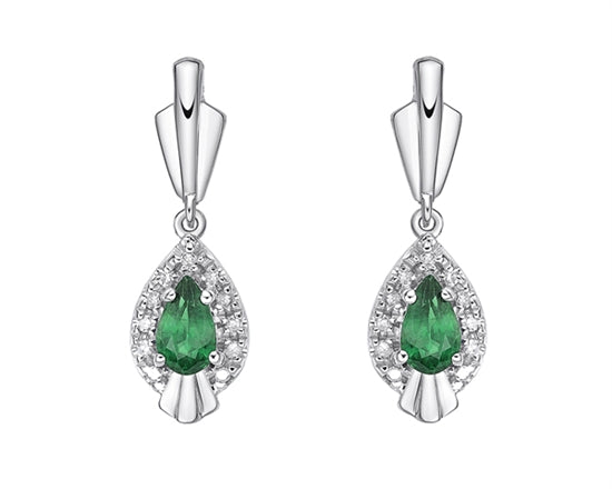 Aretes colgantes de oro blanco de 10 quilates con esmeralda de talla pera de 5x3 mm y diamantes de 0,08 quilates con respaldo de mariposa
