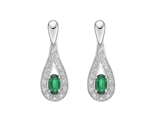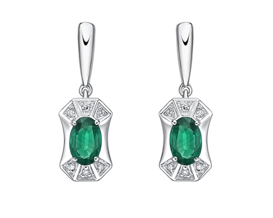 Aretes colgantes de oro blanco de 10 quilates con esmeralda de talla ovalada de 5 x 3 mm y diamantes de 0,04 quilates con respaldo de mariposa