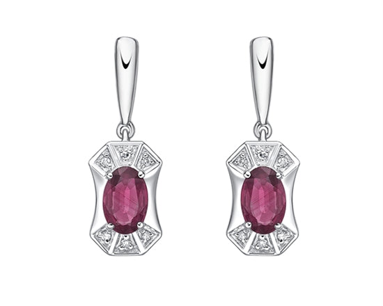 Aretes colgantes de oro blanco de 10 quilates con rubí de talla ovalada de 5x3 mm y diamantes de 0,115 quilates con respaldo de mariposa