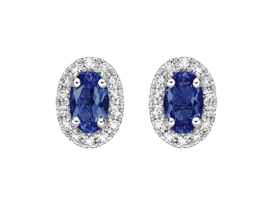 Aretes de oro blanco de 10 quilates con zafiro de talla ovalada de 5x3 mm y halo de diamantes de 0,11 quilates con respaldo de mariposa