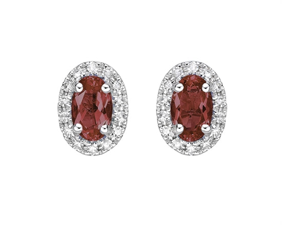 Aretes de oro blanco de 10 quilates con granate de talla ovalada de 5 x 3 mm y halo de diamantes de 0,11 quilates con respaldo de mariposa