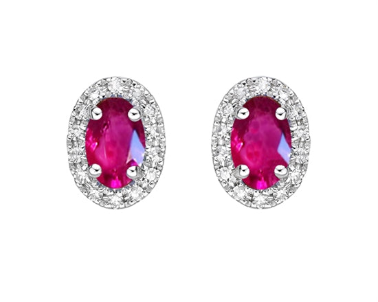 Aretes de oro blanco de 10 quilates con rubí de talla ovalada de 5 x 3 mm y halo de diamantes de 0,11 quilates con respaldo de mariposa