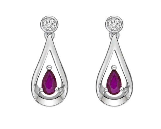 Aretes colgantes de oro blanco de 10 quilates con rubí de talla pera de 5x3 mm y diamantes de 0,08 quilates con respaldo de mariposa