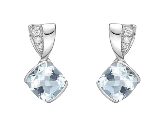 Pendientes colgantes de oro blanco de 10 quilates con aguamarina de talla cojín de 6,0 mm y diamantes de 0,051 quilates