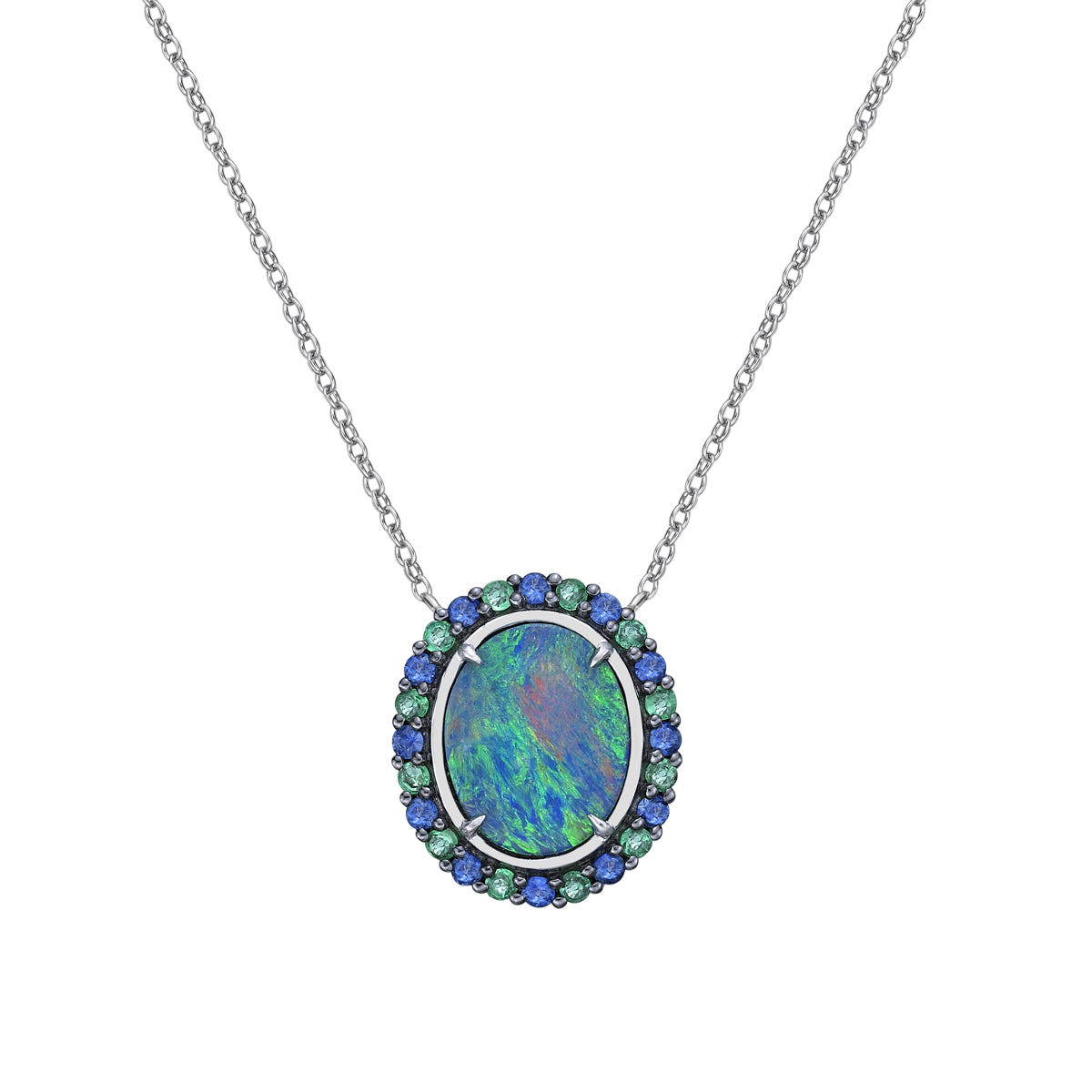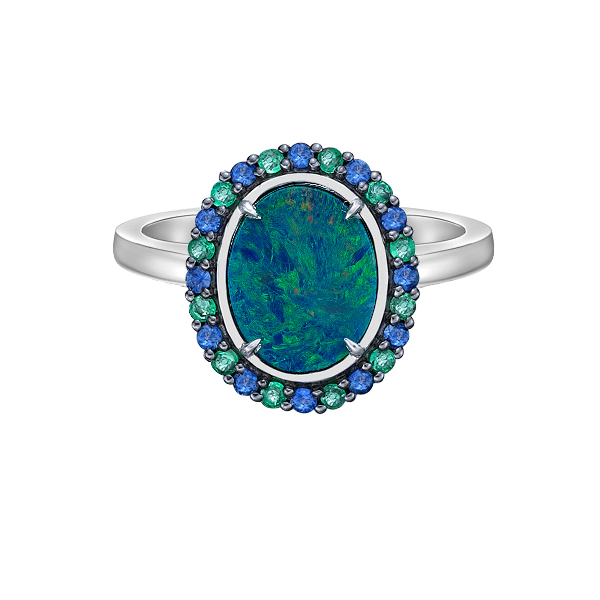 10K White Gold Australian Opal doublet ring with Emerald & Sapphire Halo