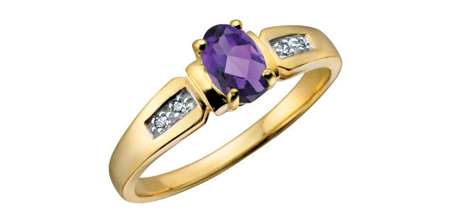 Anillo de oro amarillo de 10 quilates con amatista de talla ovalada de 0,44 quilates y diamante de 0,02 quilates, talla 6,5