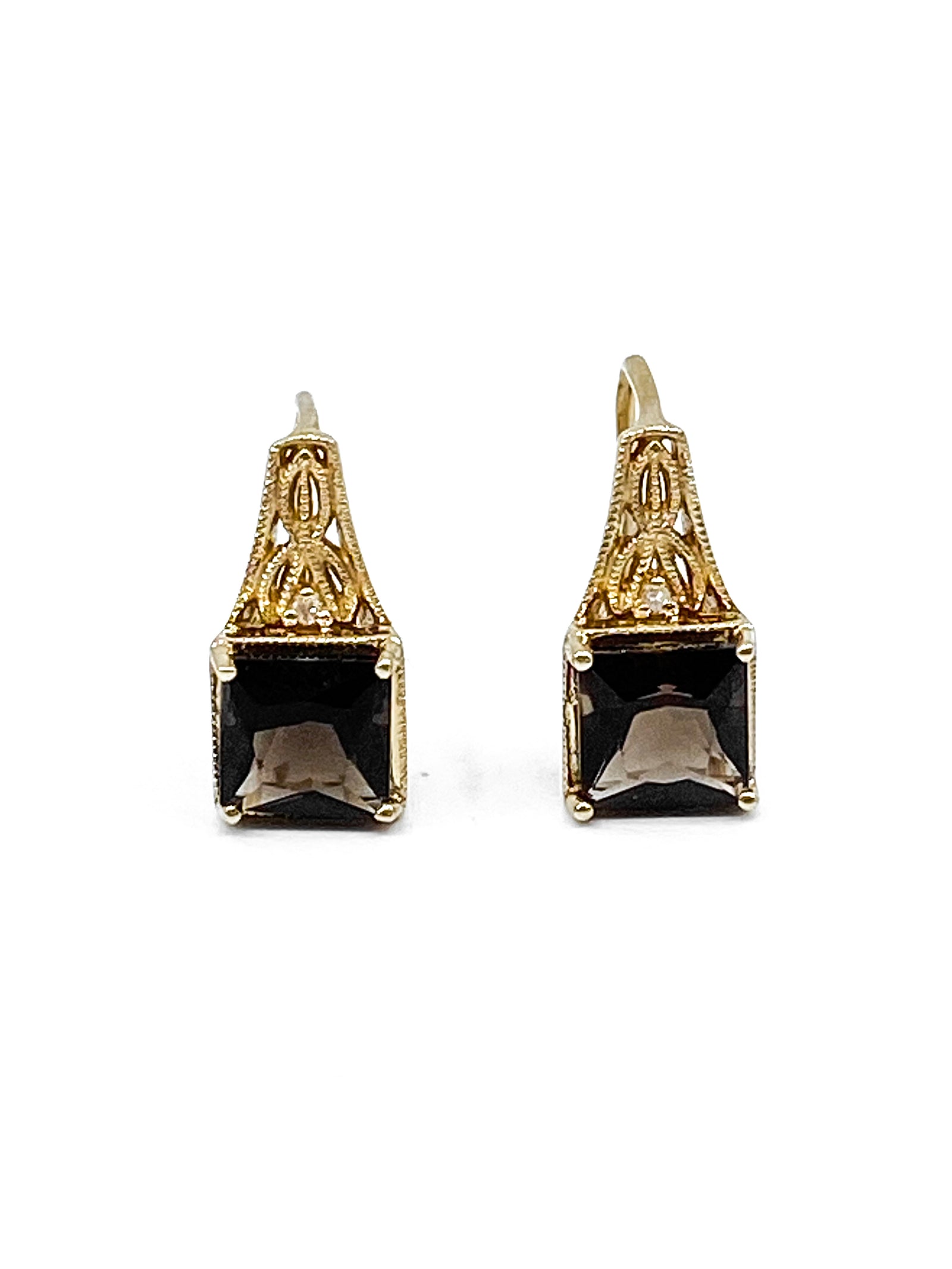 Pendientes colgantes / colgantes de oro amarillo de 10 quilates con cuarzo ahumado de 2,0 quilates y diamantes de 0,01 quilates