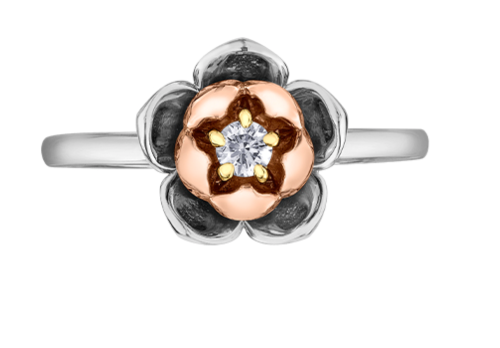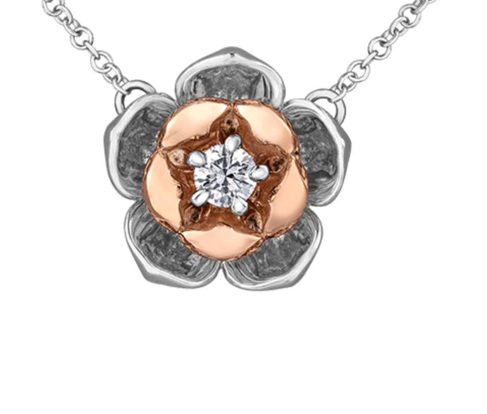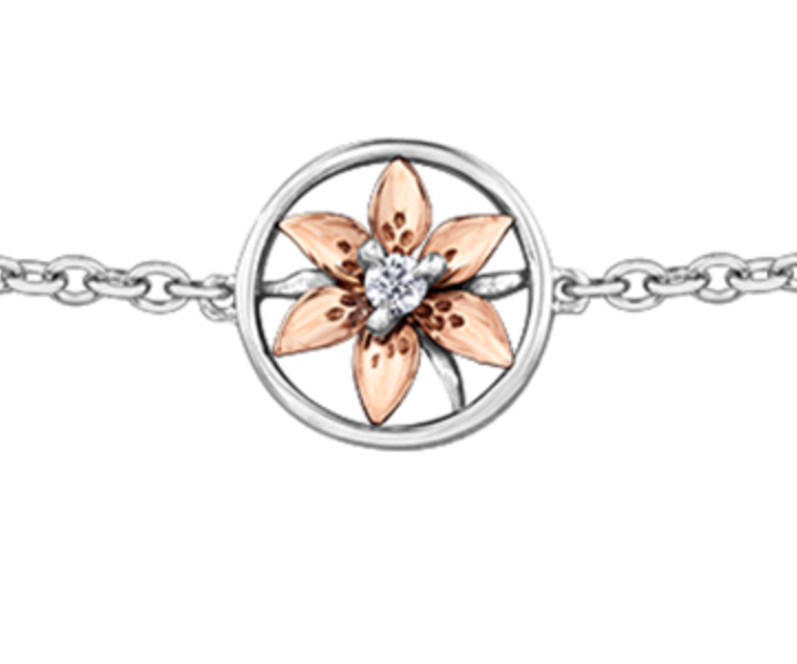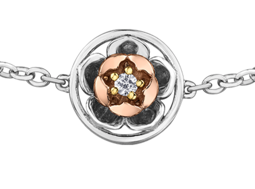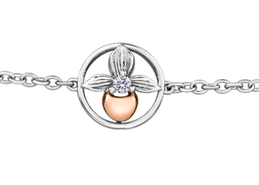 Pulsera de diamantes con flor provincial de zapatilla de dama de la Isla del Príncipe Eduardo de 0,04 quilates en oro blanco y rosa de 14 quilates