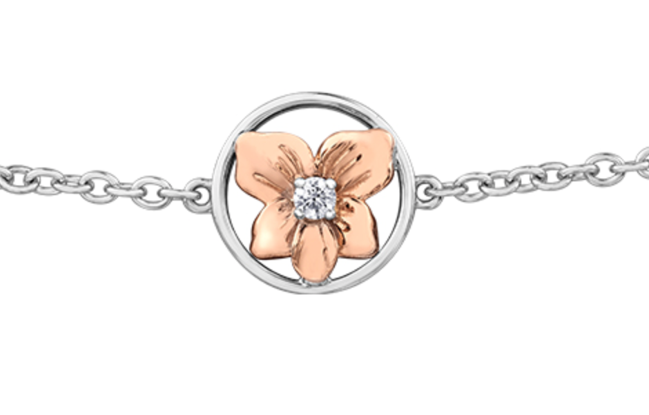 Pulsera de diamantes con flor provincial violeta violeta de Nuevo Brunswick de oro blanco y amarillo de 14 quilates de 0,04 quilates