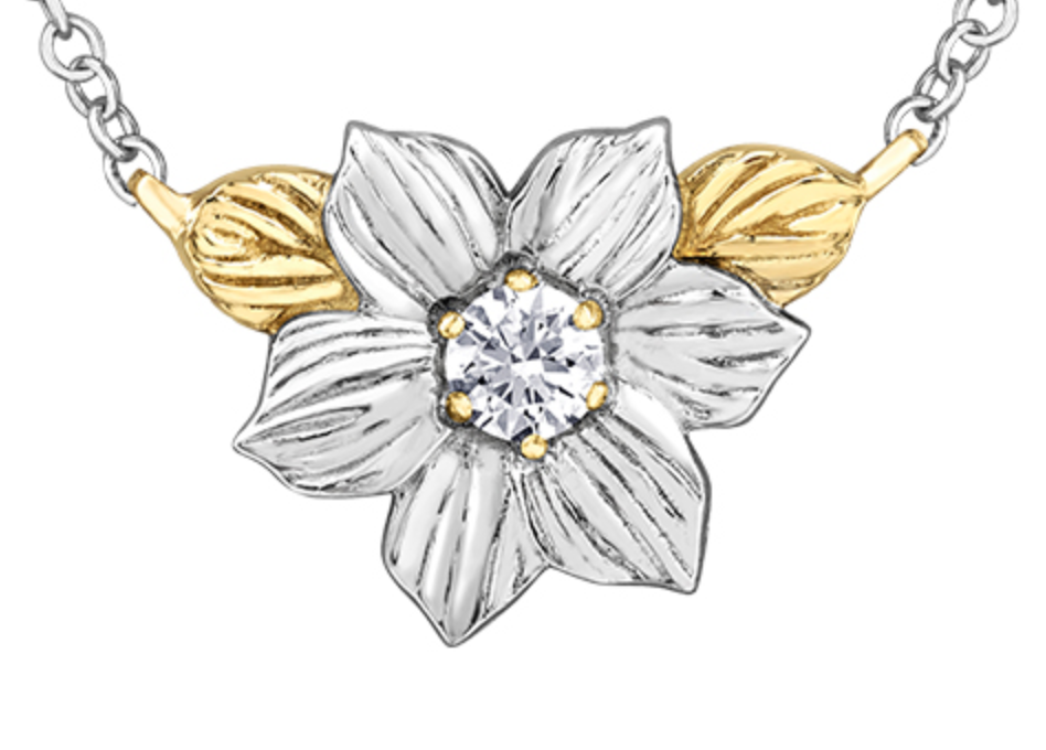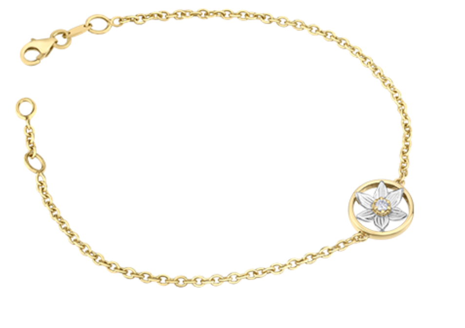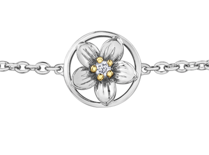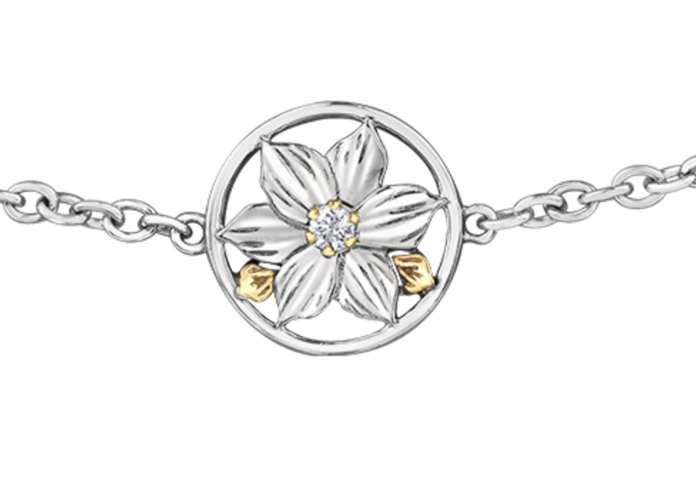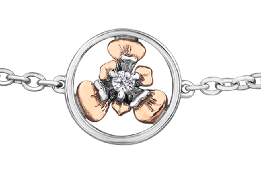 Pulsera de diamantes con flor provincial de azafrán de pradera de Manitoba de 0,04 quilates de oro blanco y amarillo de 14 quilates