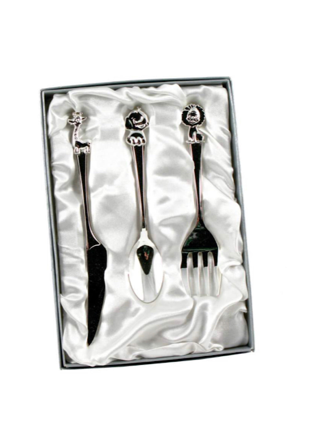 Este juego de cubiertos chapado en plata de 3 piezas es el regalo perfecto para la primera experiencia culinaria de cualquier niño. Los rasgos de animales en los mangos hacen que el uso de los cubiertos sea divertido.