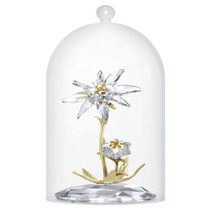 Created to celebrate Swarovski’s 130th anniversary, this wondrous bell jar is dedicated to the original Edelweiss emblem. The flowers themselves reveal a total of 259 precision-cut facets, with yellow pistils, and glossy stems and leaves in champagne gold-tone metal. Protected and displayed beneath a glass bell, this special creation is a showcase of Swarovski’s finest savoir-faire and enduring heritage. Decoration object. Not a toy. Not suitable for children under 15.