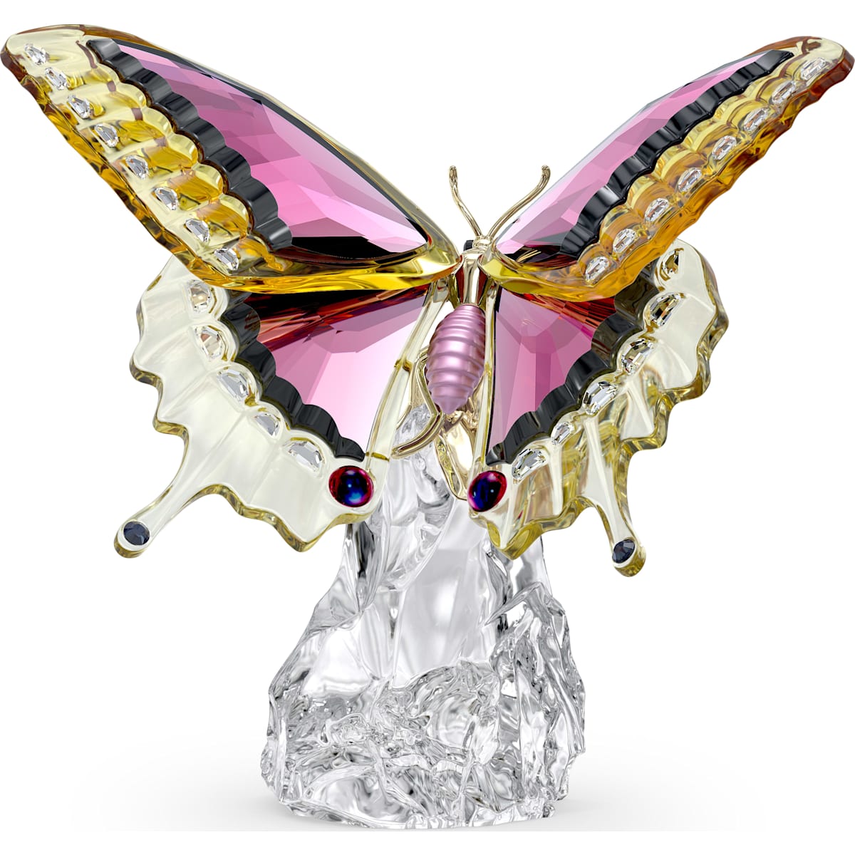 Esta delicada y elegante mariposa está diseñada para aportar un toque de color a su hogar. Lista para emprender el vuelo con las alas abiertas, la mariposa está elaborada con 726 facetas y adornada con 34 cristales planos. Los detalles lacados en negro y los detalles en tono dorado crean el bonito patrón de alas, mientras que el cuerpo de la mariposa está elaborado en metal lacado rosa. Un diseño inspirado en la naturaleza que rinde homenaje a la herencia de maestría técnica y creativa de Swarovski. Objeto de decoración. No un juguete. No apto para niños menores de 15 años. ​