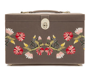 De cara fresca y divertida, Zoe es sofisticada pero juguetona. El suave cuerpo de visón del estuche grande, altamente bordado con diseños florales clásicos, es tan hermoso como los accesorios que contiene en su interior. Incluye exterior de terciopelo, interior LusterLoc™, herrajes dorados pálidos y una mini pieza de viaje extraíble.