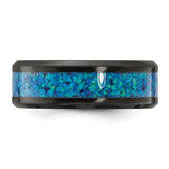 Banda pulida de circonio negro con incrustaciones de ópalo de imitación azul de 8 mm Chisel® - Tamaño 7 a 13