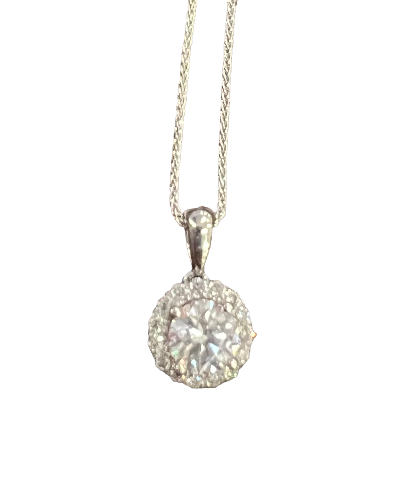 Collar con halo de diamantes cultivados en laboratorio de 0,86 quilates de oro blanco de 14 quilates con cadena de trigo